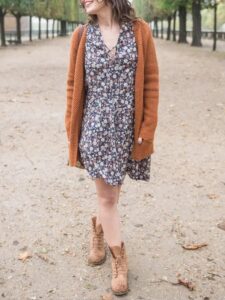 Quand au look que j’aimerais porter au quotidien : robe fleurie + gilet long + collants opaques + boots/derbies + foulard, je suppose que c’est plus parce que le futal et les chaussettes sont plus commodes et rapides à enfiler, et que j’ai moins de scrupule à rouler dans la boue avec!