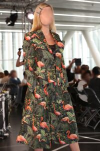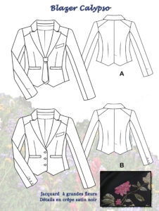 En gros, je suis constamment en pantalon, jean ou chino, et maillot en jersey de coton, sans froufrous qui dépassent, des matières douces, souples et respirantes. Et je me retrouve à songer avec mélancolie à mes jolies robes, mes jupes et mes chemisiers conçus et cousus avec amour, aux blazers que je rêve d’arborer pour me la péter « La Giga-Classe à Dallas », mais que je n’ai pas l’occasion de porter, puisque je ne sors plus du tout. En particulier le blazer Calypso que j’avais créé pour le défilé de deuxième année – et mon diplôme de fin d’études – pour lequel je n’ai même pas encore acheté les tissu.
